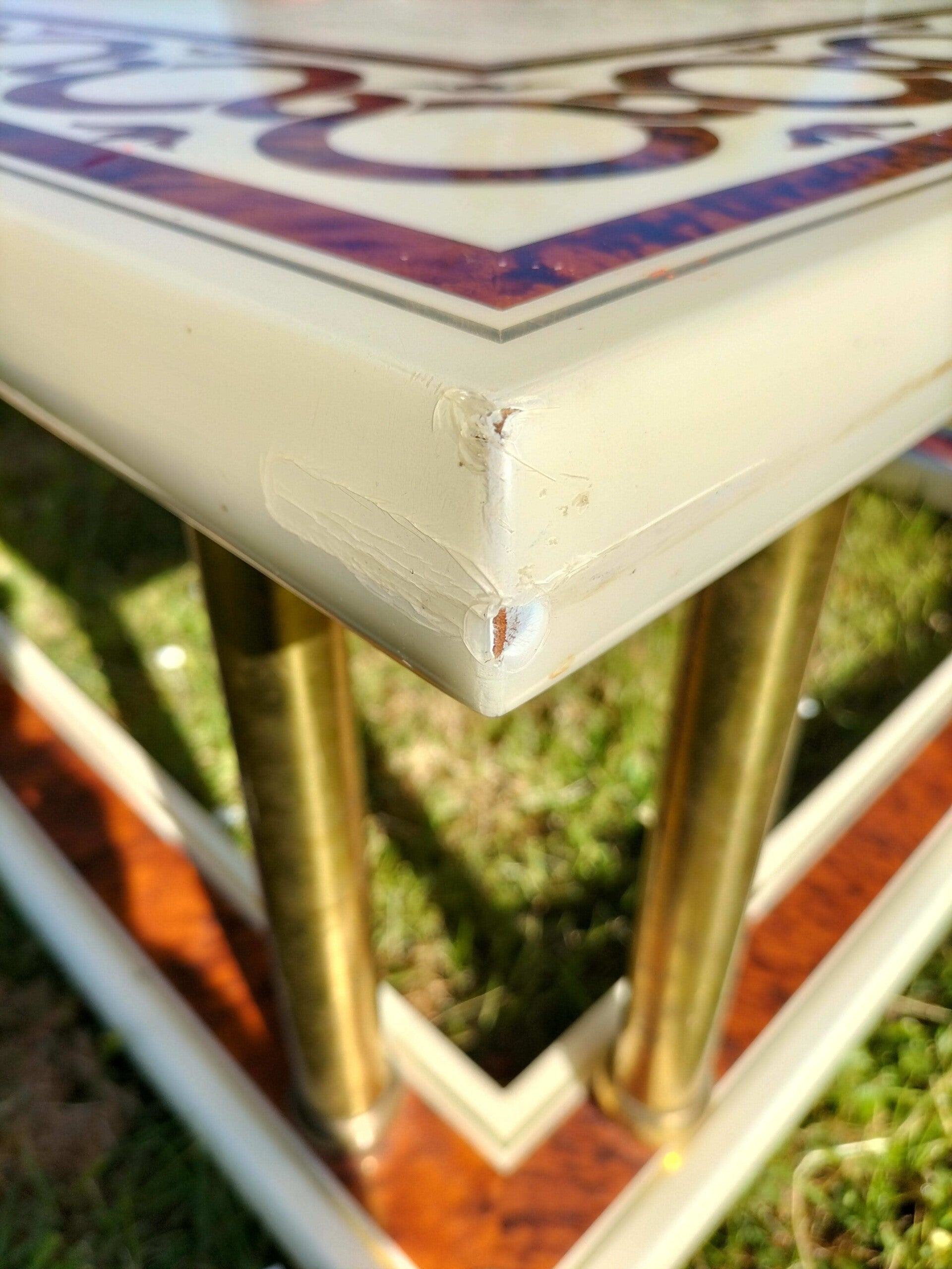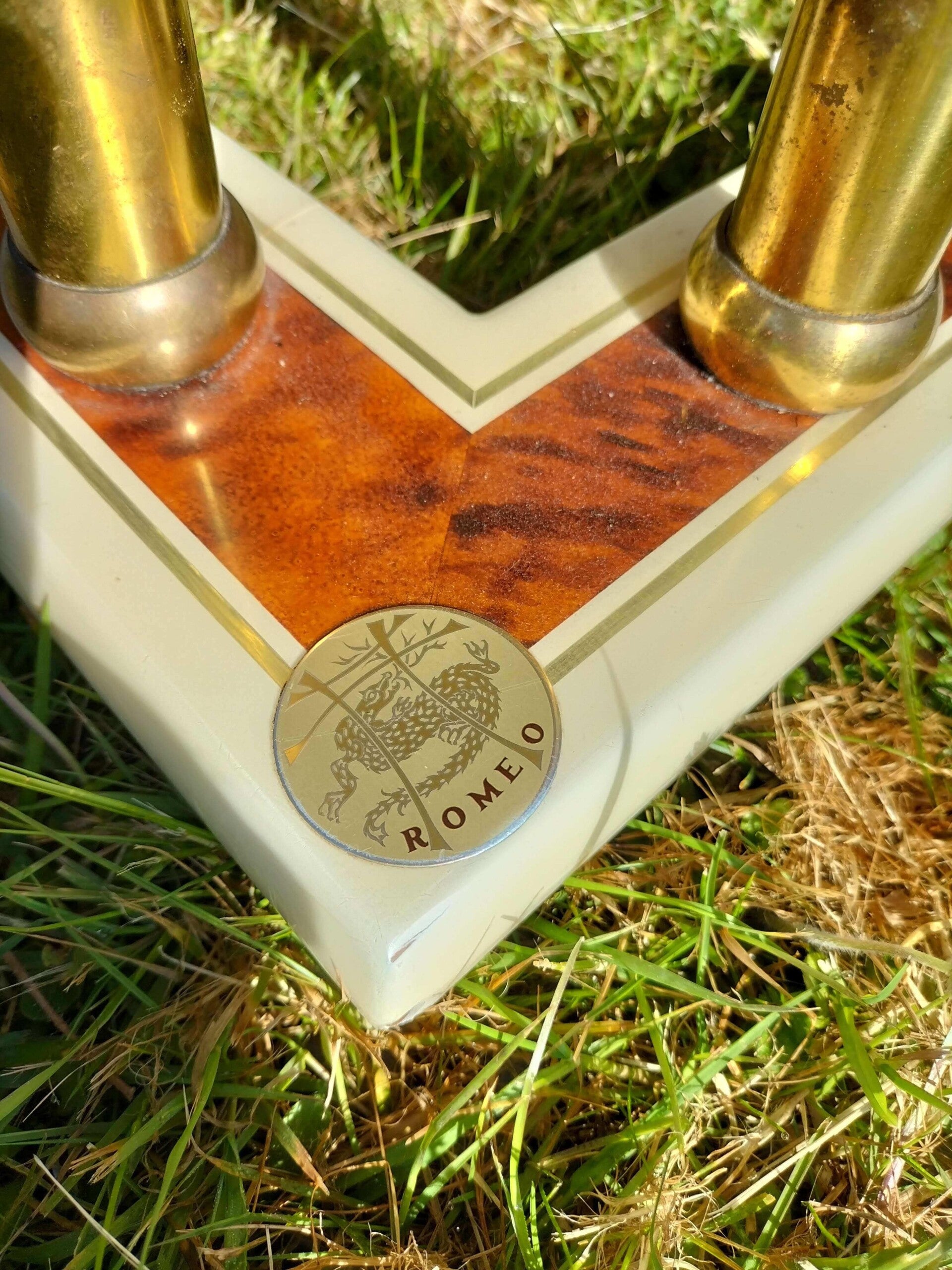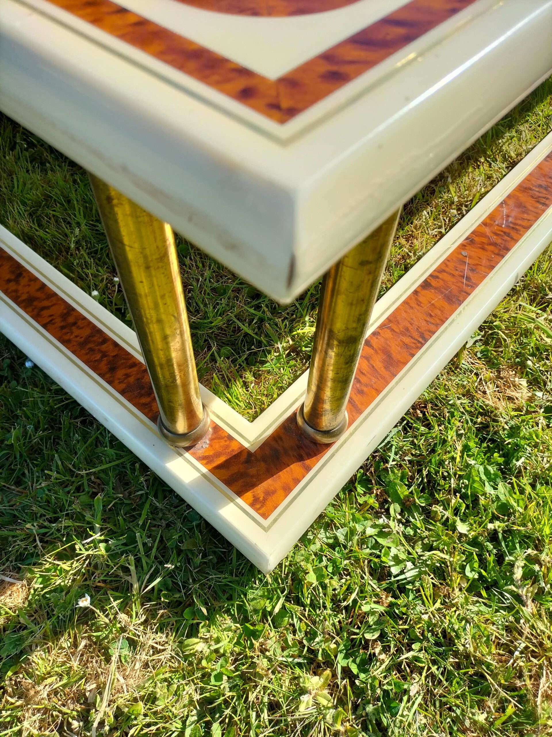 Grande table basse de la Maison Roméo datant des années 70/80. Plateau en bois laqué de couleur crème et marron, piètement en laiton. Elle est dans son jus, manques de laque, rayures et une tache brune sur le plateau.