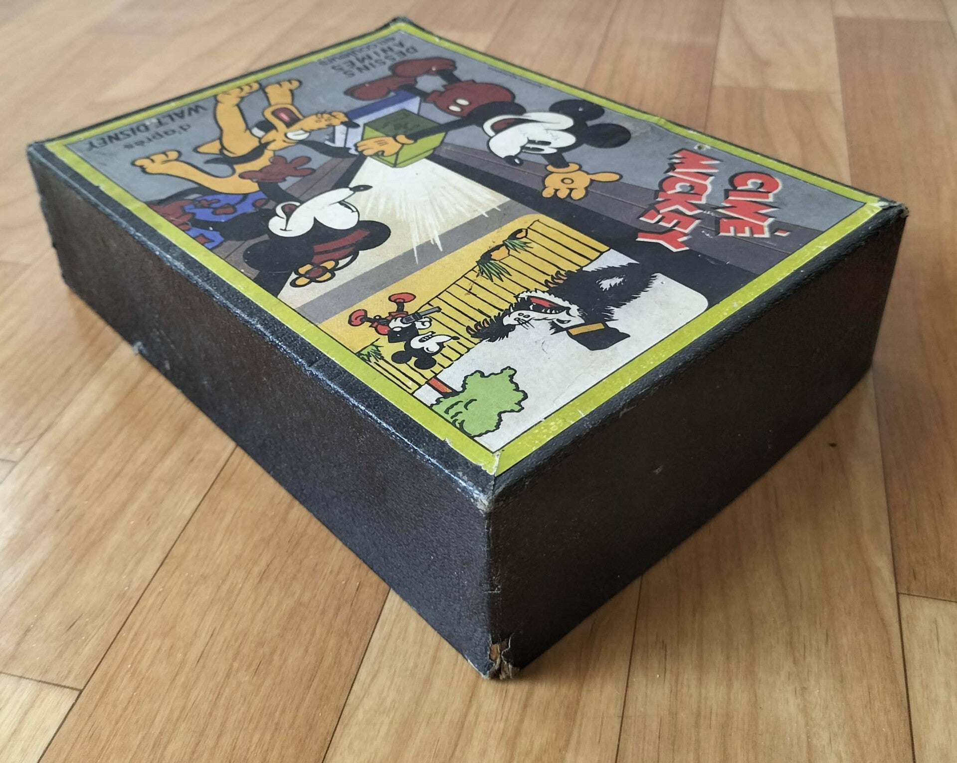 Boite d'origine seule pour Ciné Mickey , Walt Disney, datant des années 30.La boite mesure 24 Cm x 17 Cm x 6,2 CmDans son état d'origine, traces du temps et un coin du couvercle ouvert (voir photos).