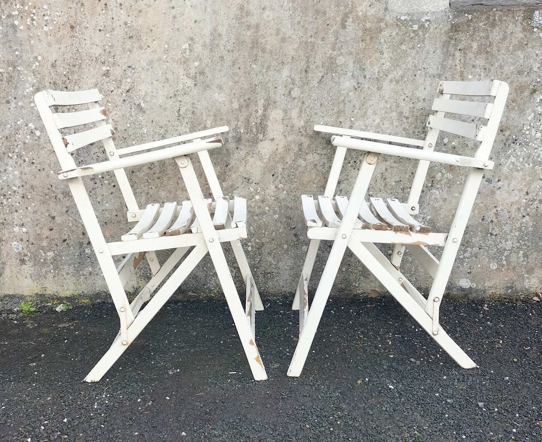 Paire de fauteuils pliants de jardin vintage en bois. Dans sa patine d'origine. Traces du temps, la peinture est à revoir, bois en bon état stables et solides.