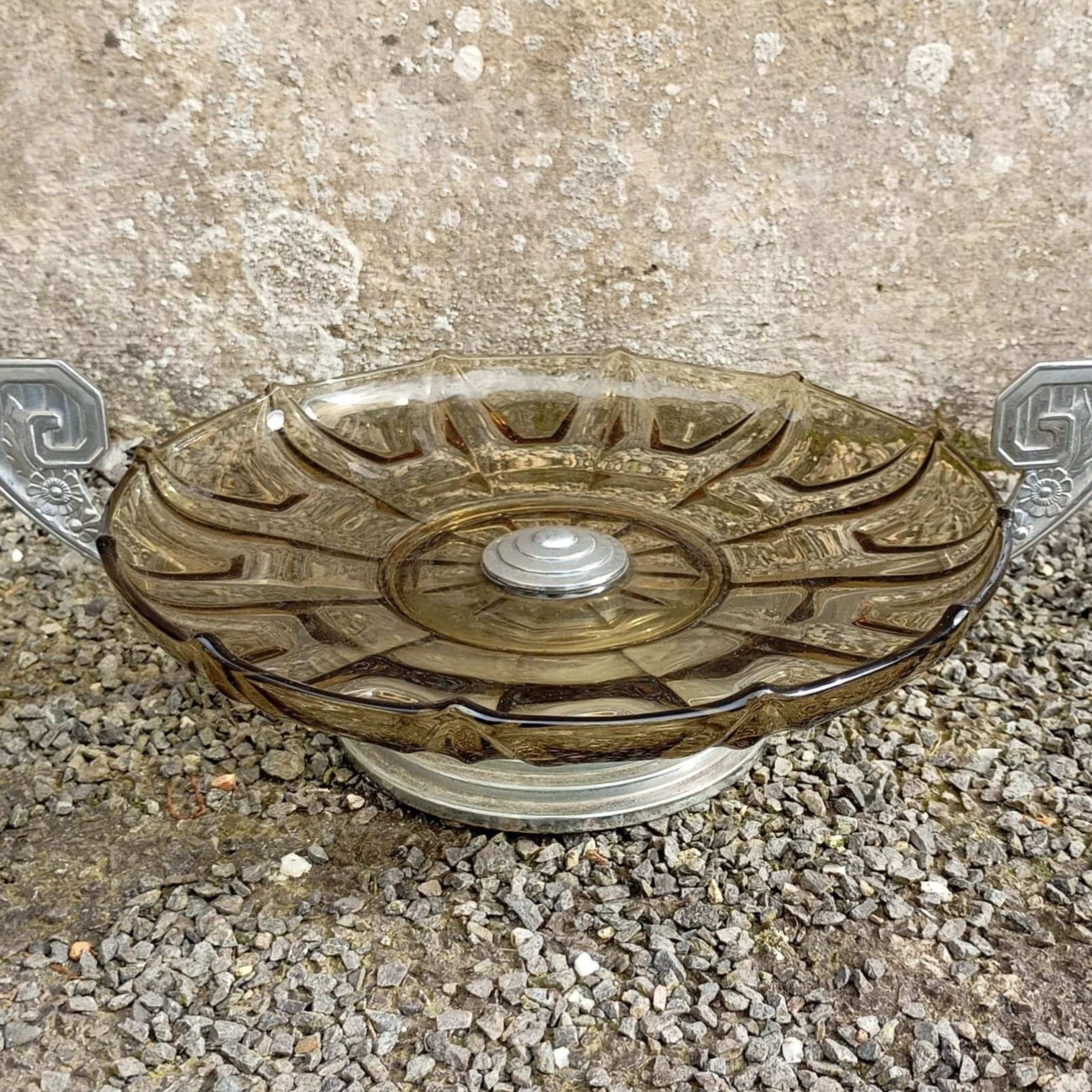 Support à gâteau, assiette à sandwichs, présentoir Art Déco en verre fumé avec poignées et base en aluminium. Bon état général, traces du temps visibles sur les photos.