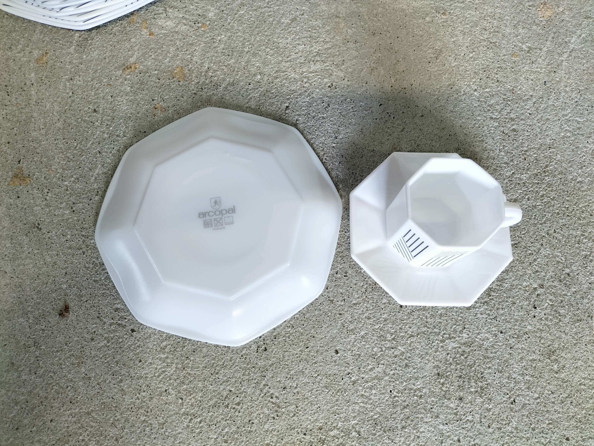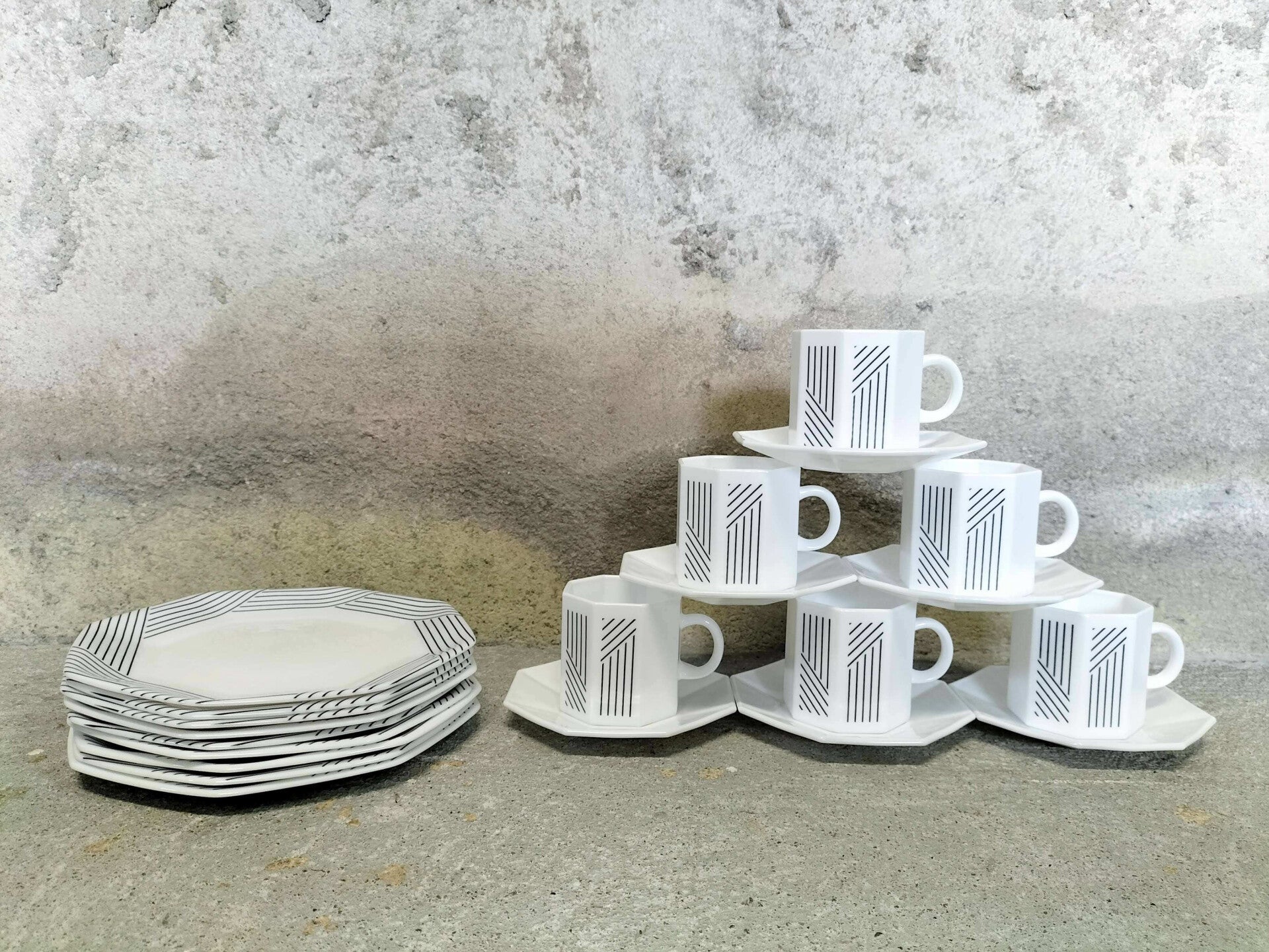 Service de 6 tasses et sous-tasses plus 9 assiettes à dessert octogonales à liseré géométrique noir et blanc, signé Arcopal, modèle Octime. Made in France. Passe au micro-ondes et au lave vaisselle.