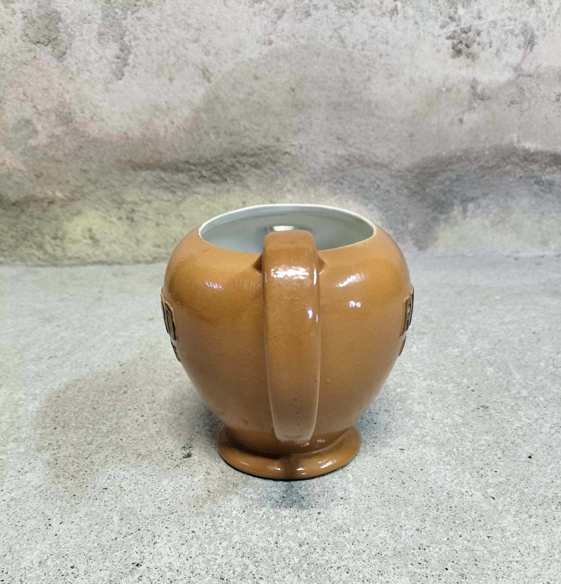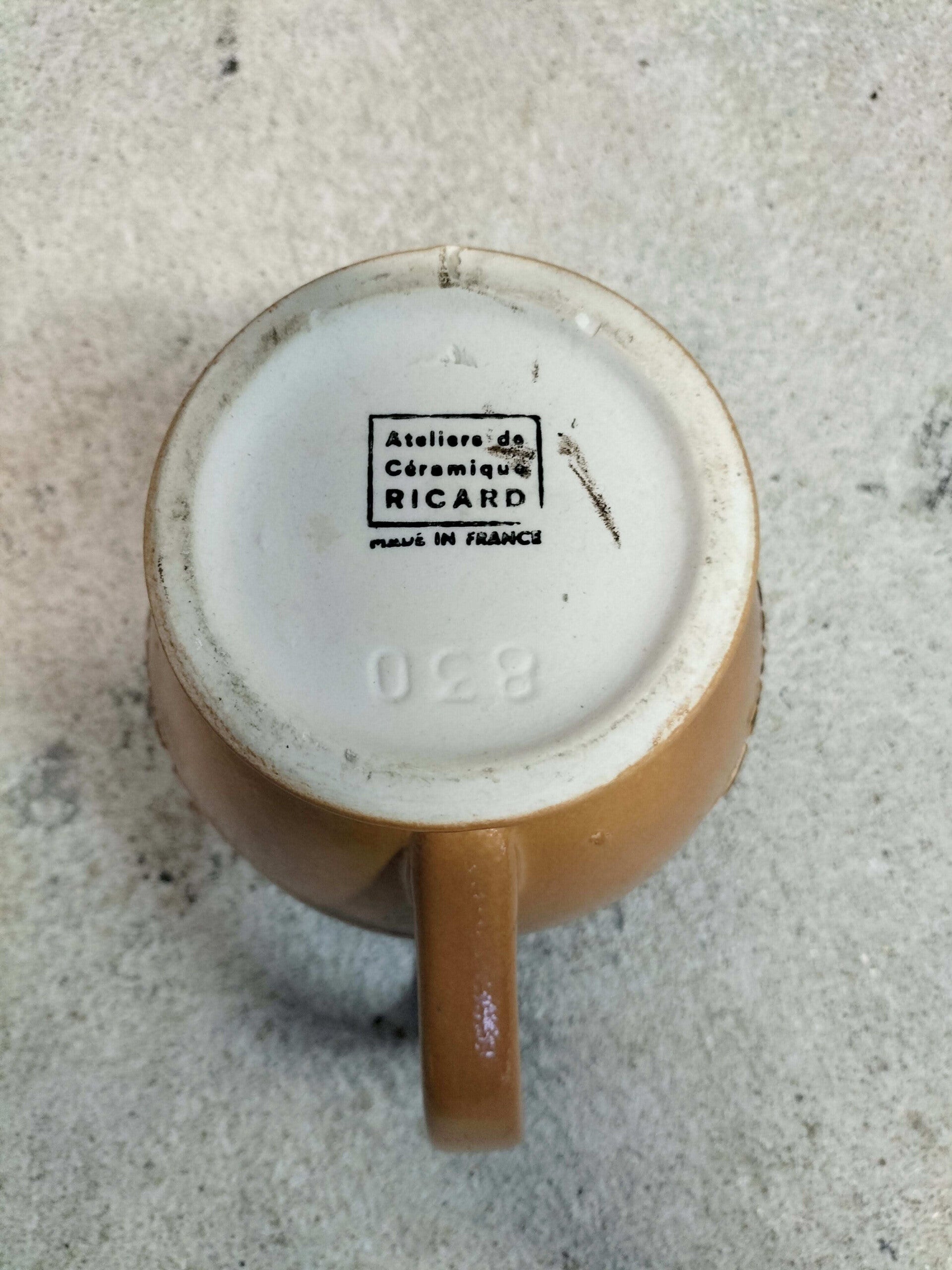 Carafe Ricard Anisette en céramique marron foncé. Inscription sous le pot : 830, Ateliers de Céramique Ricard, Made in France.