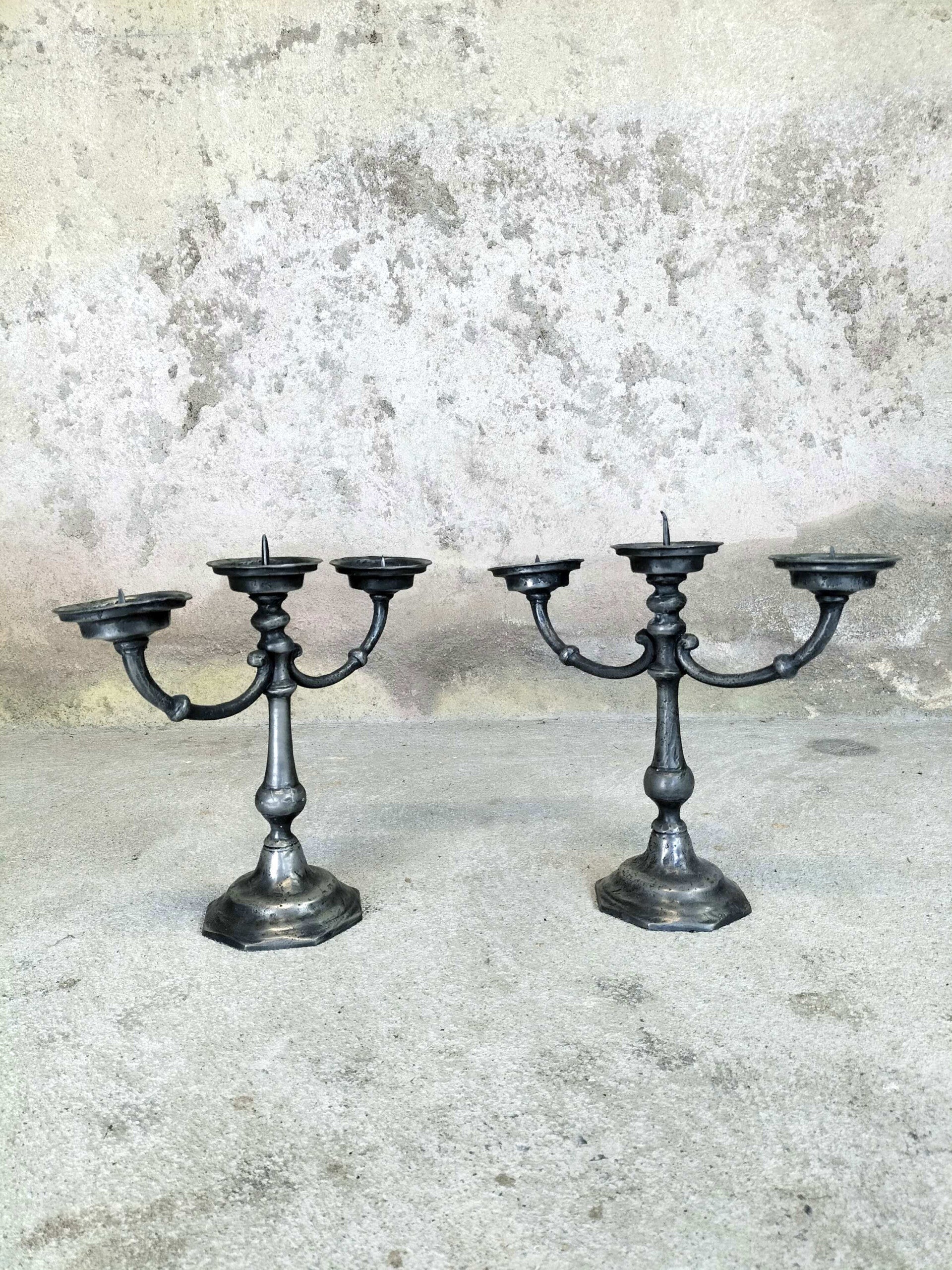 Paire de chandeliers/candélabres trois feux en étain poinçonnés.