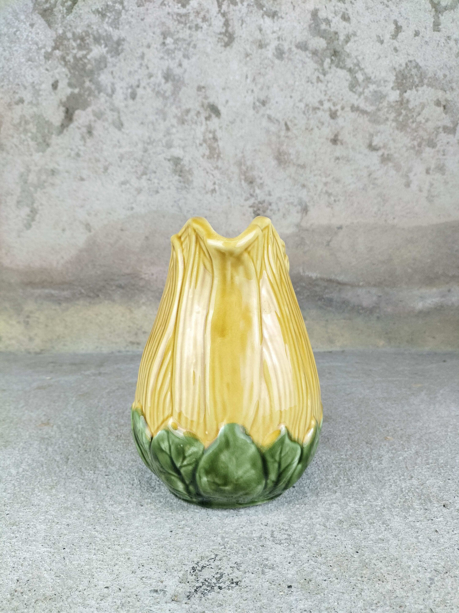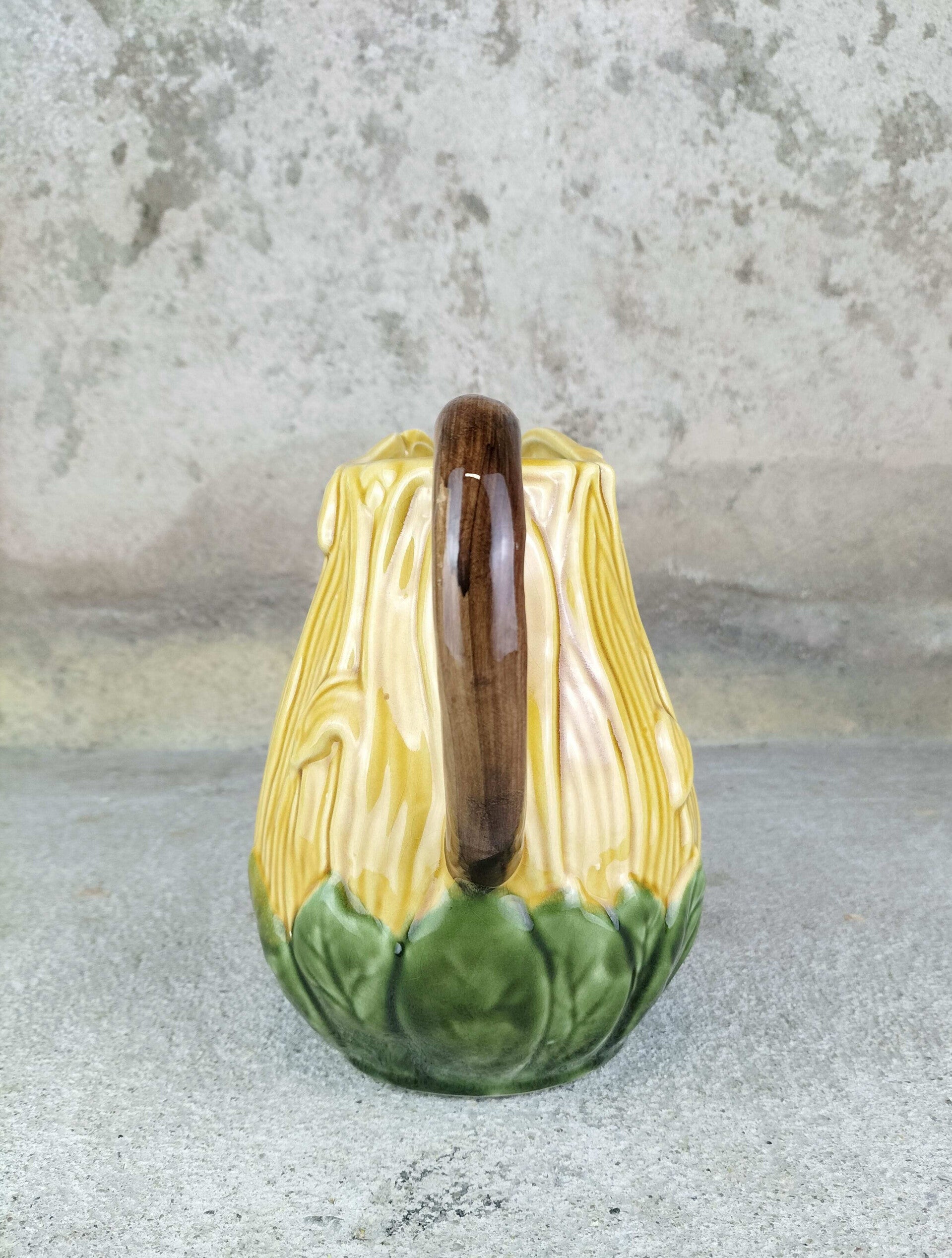 Pichet vintage en barbotine jaune, verte et marron. Bon état.