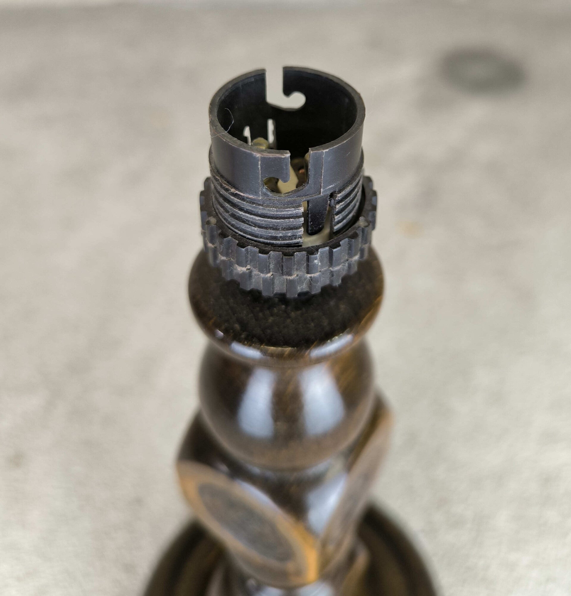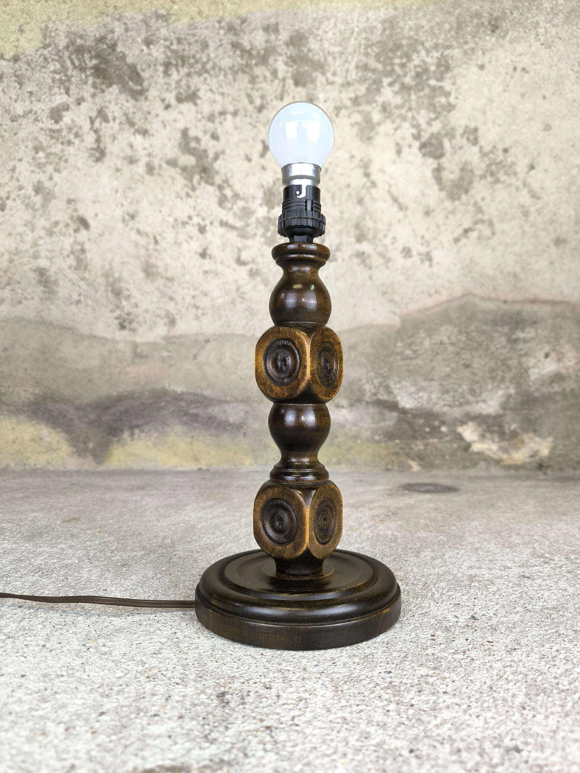Lampe de table, à poser vintage, en bois tourné. Bon état, fonctionne avec une ampoule de type B22 non fournie.