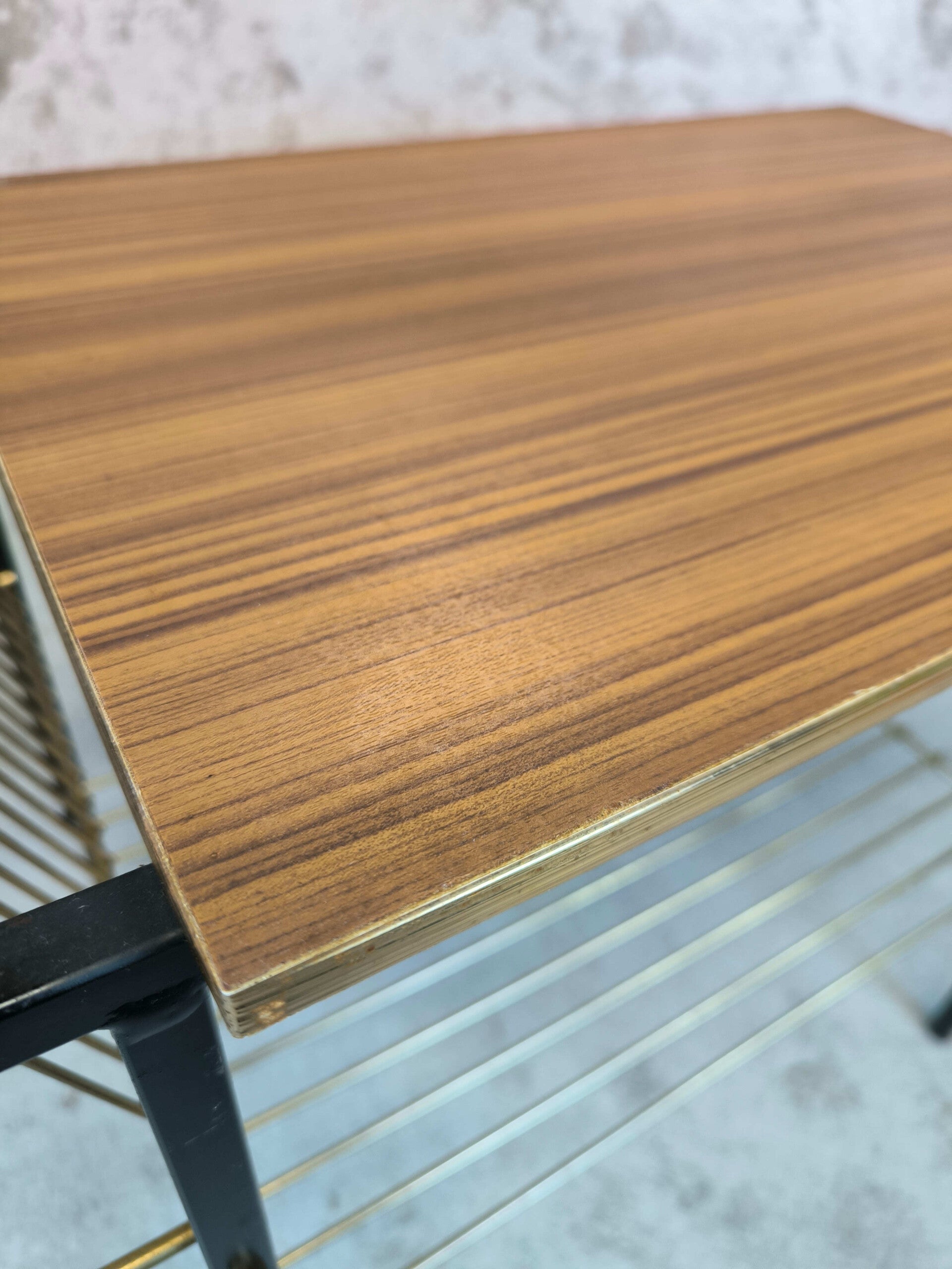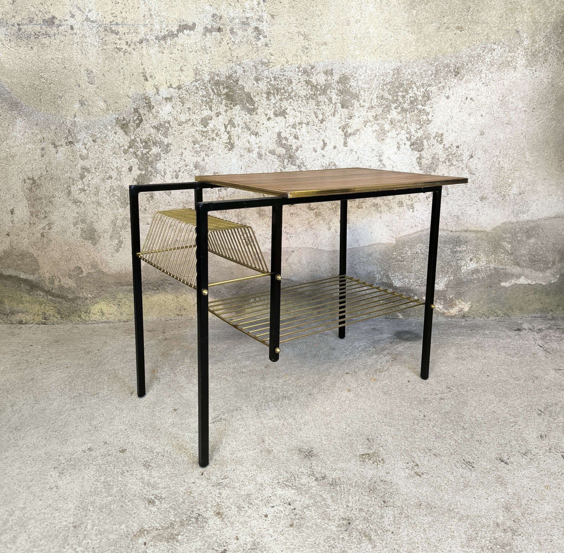 Tablette porte revues/vinyles vintage en bon état général, traces du temps visibles sur les photos.