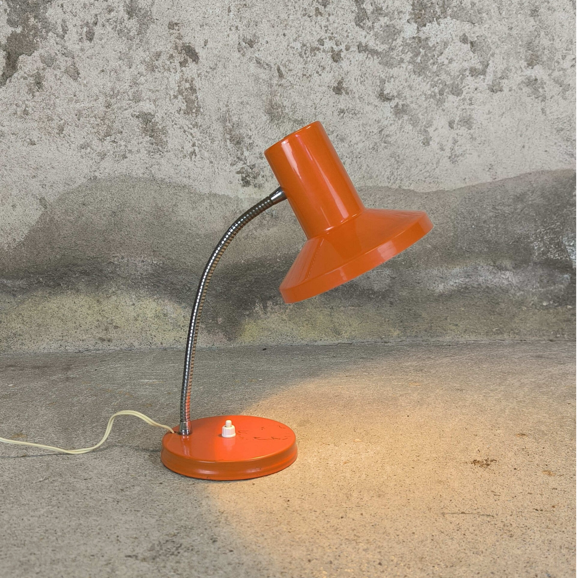 Lampe de bureau vintage en métal laqué orange datant des années 70. Bon état général, quelques traces du temps visibles sur les potos. Fonctionne avec une ampoule de type B22 non fournie.