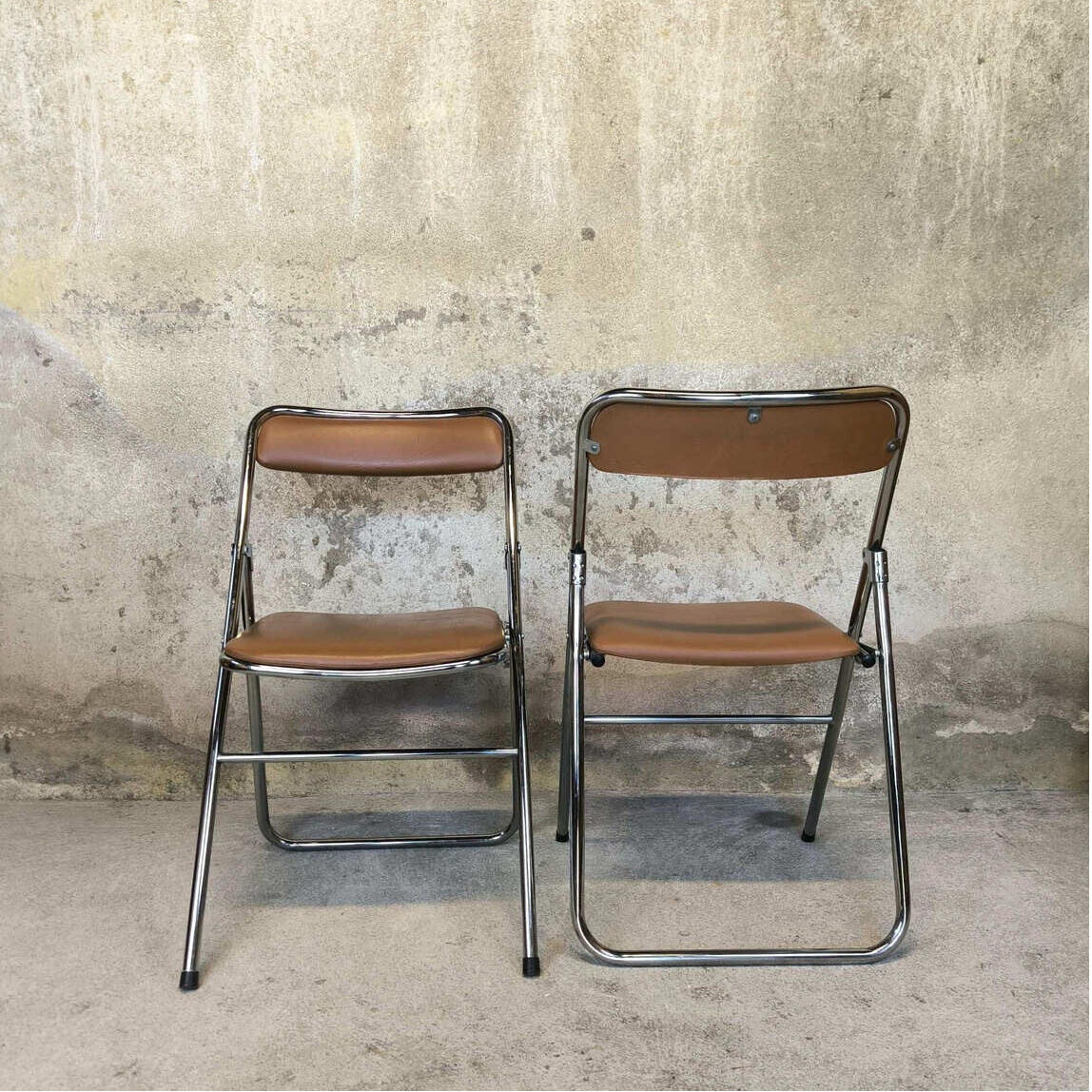 Paire de chaises vintage pliantes en chrome et simili cuir marron éditées par Soudexvinyl.