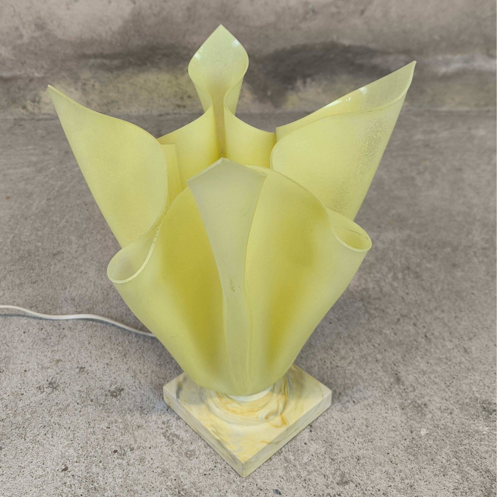 Lampe à poser vintage en plastique jaune en forme de corolle dans le gout des lampes de Georgia Jacob. Bon état général, quelques traces du temps visibles sur les photos.